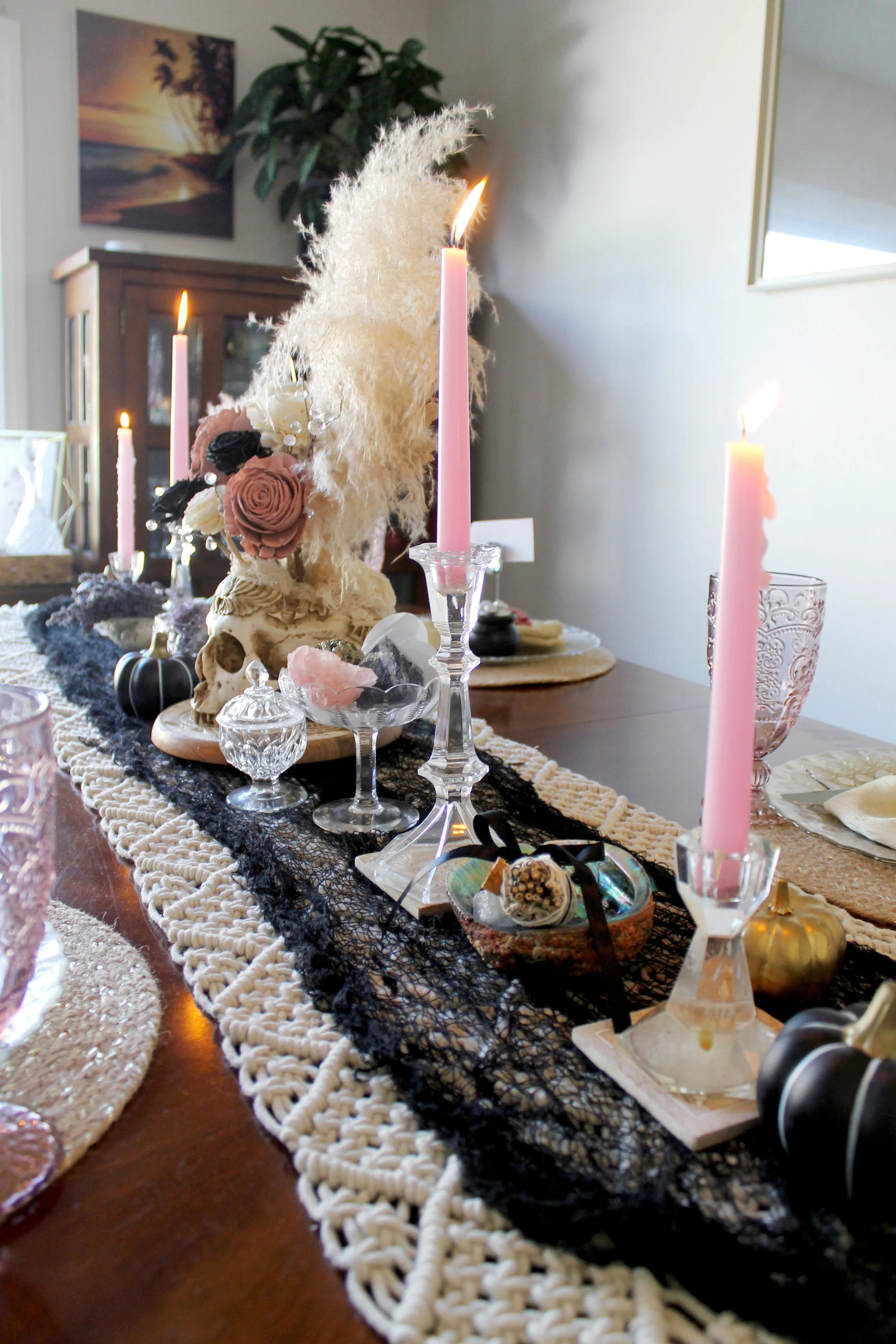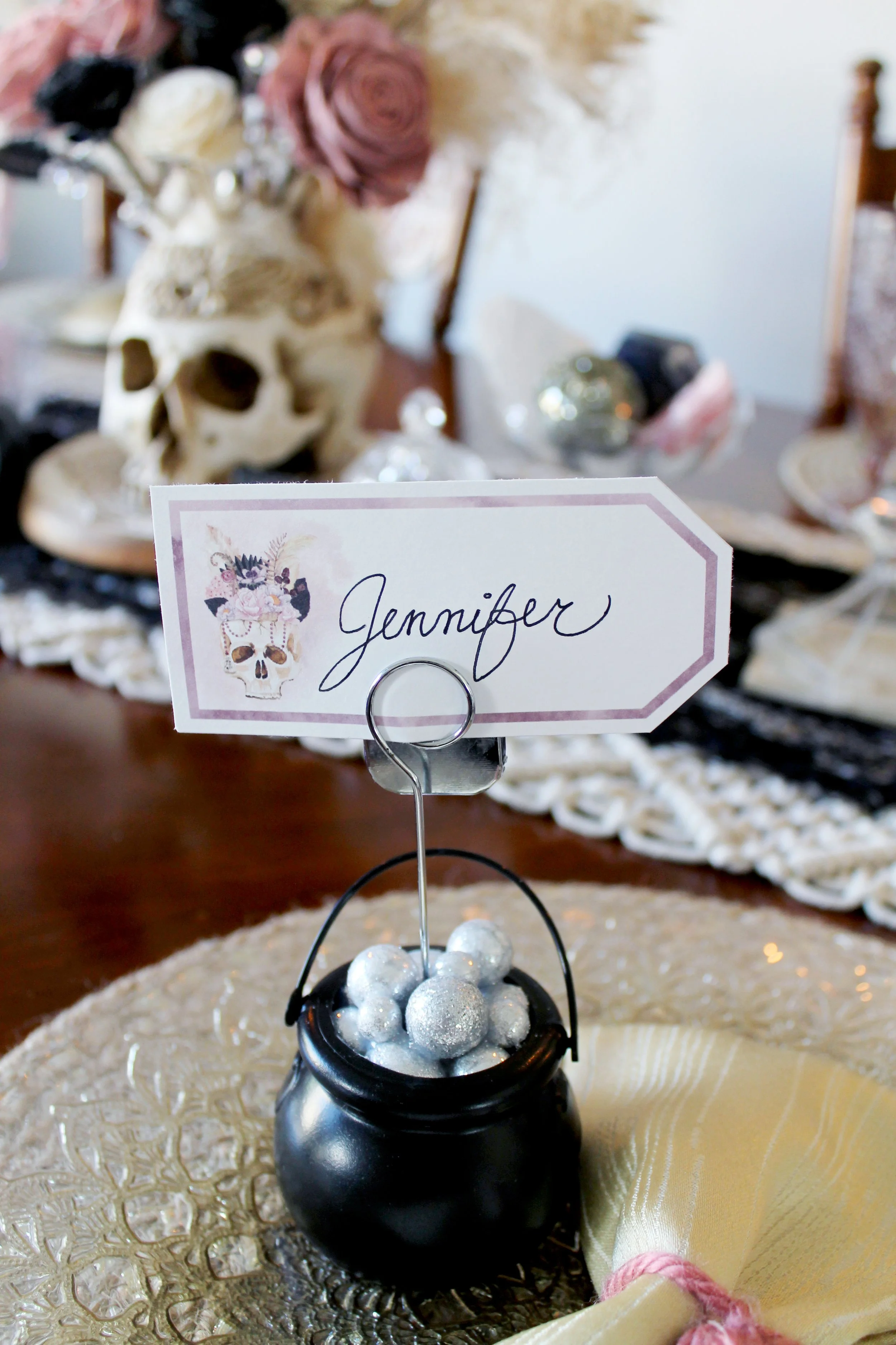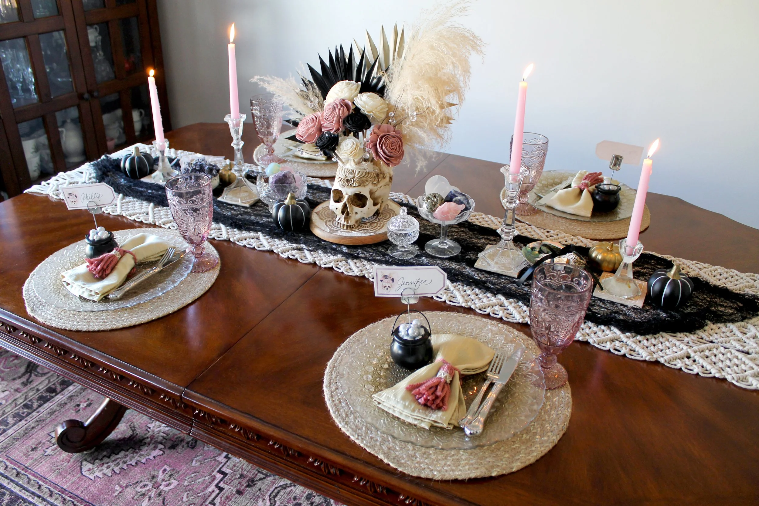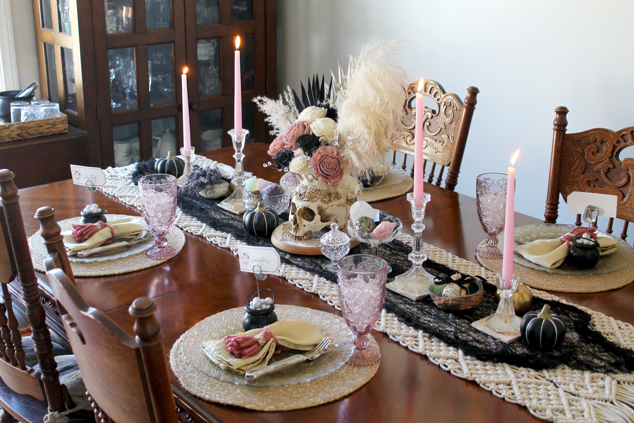 DIY Cauldron place card holders welcomed guests to their seats at the table, which was decorated with sprawling ceramic pumpkins and cut crystal bowls filled with gemstones, accompanied by mystical herbs. Dried palms & wooden florals in an ornamental resin skull vase served as the centerpiece, which sat upon a macrame table runner layered with a black mesh cloth.