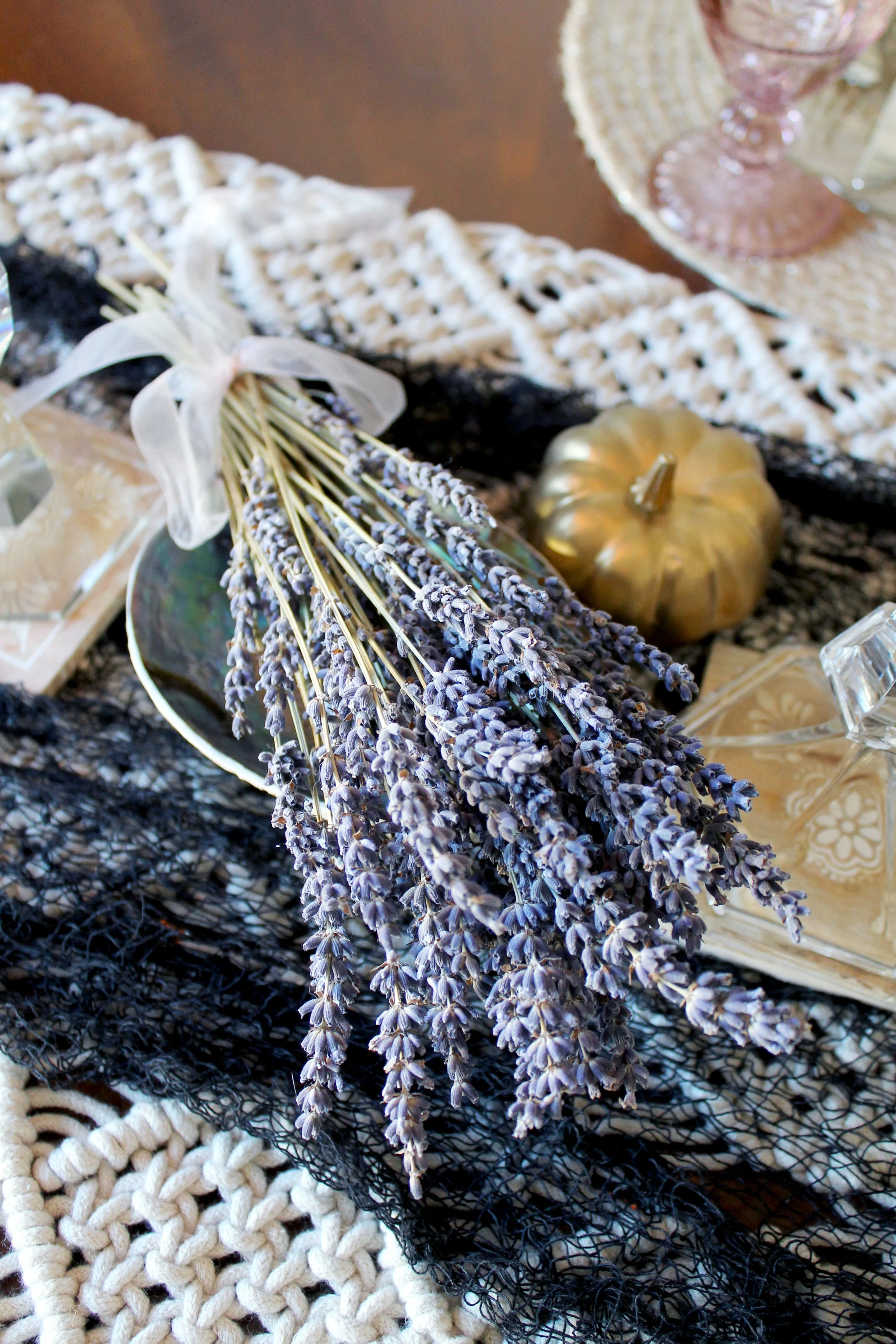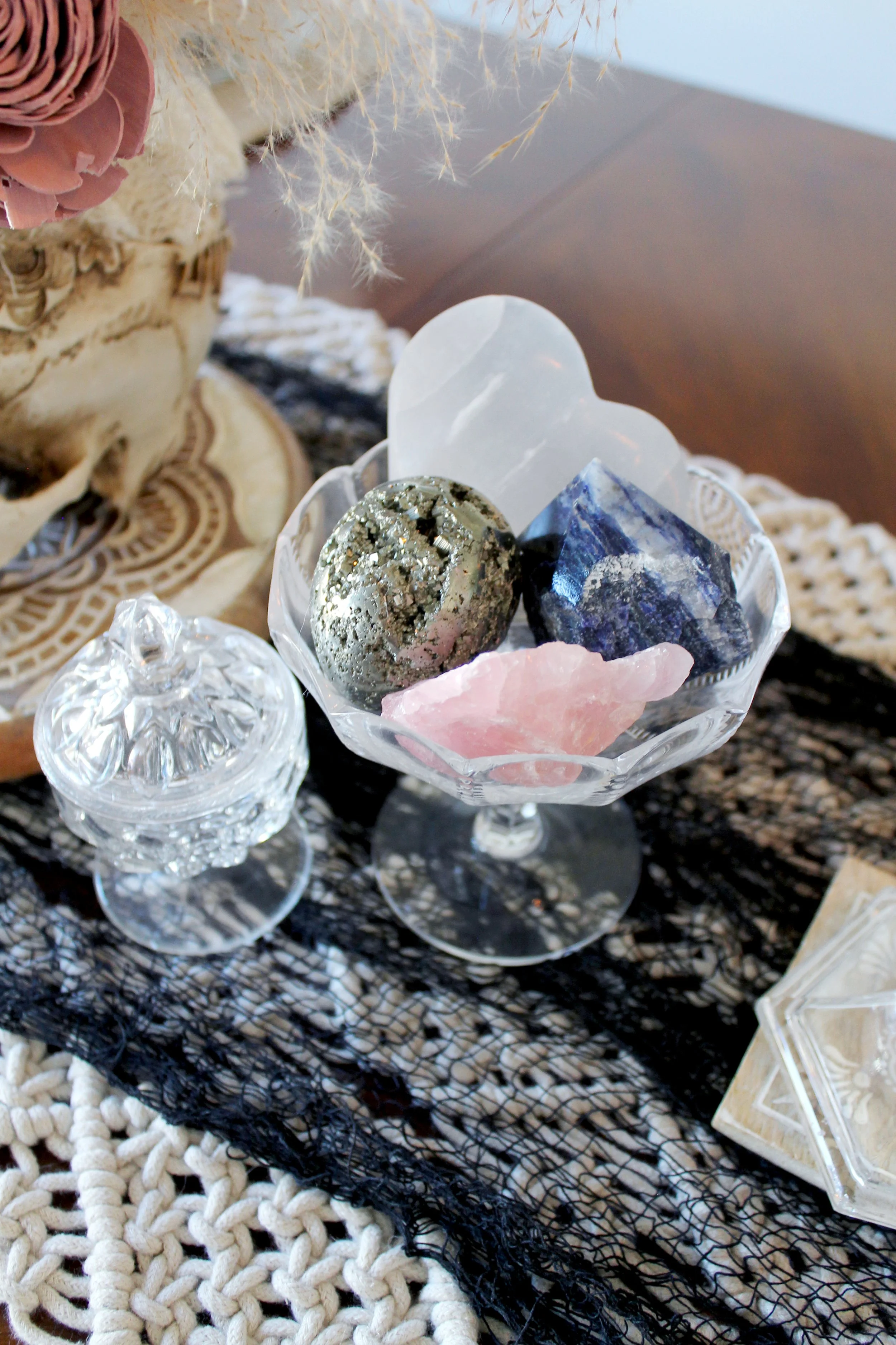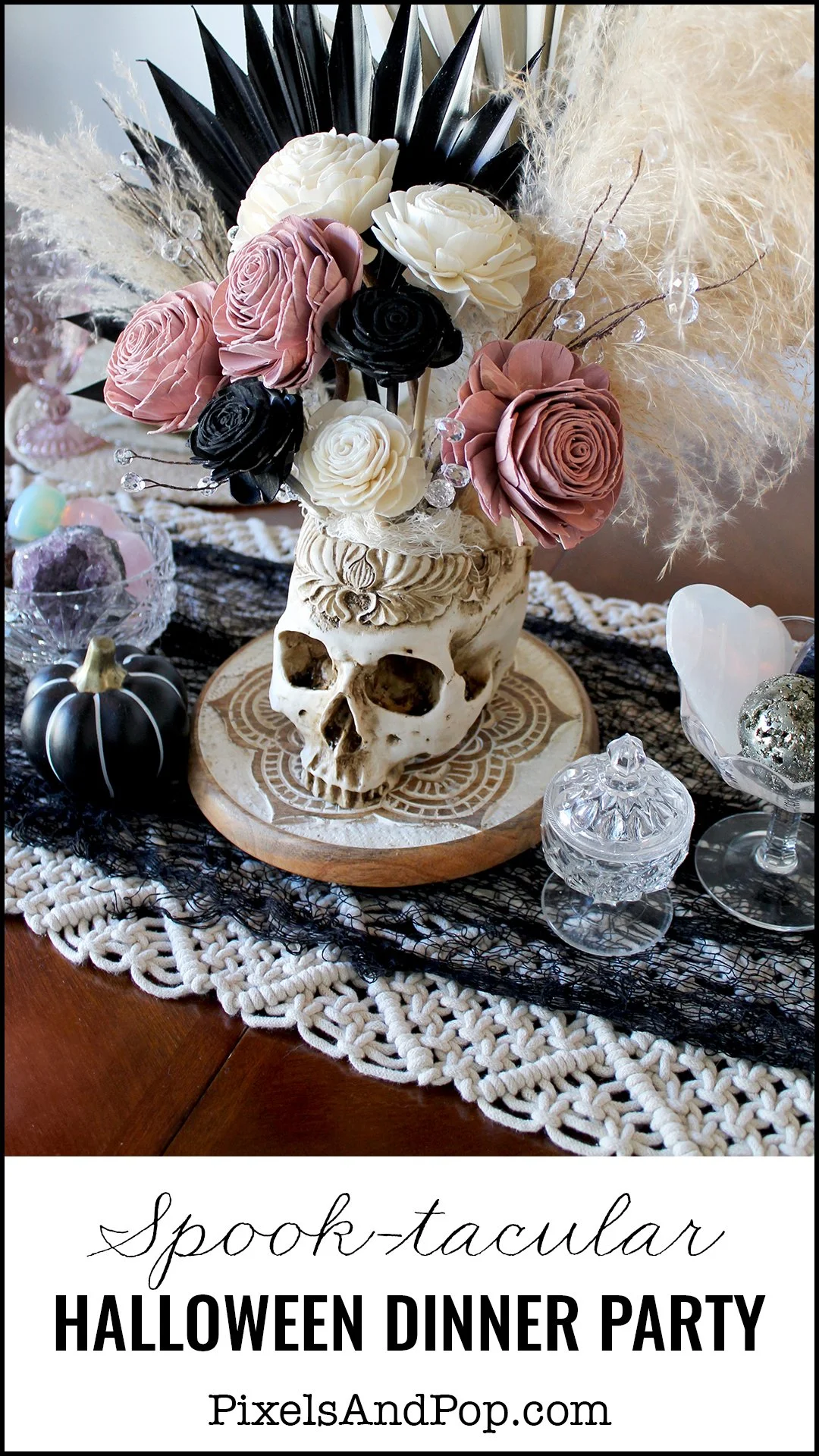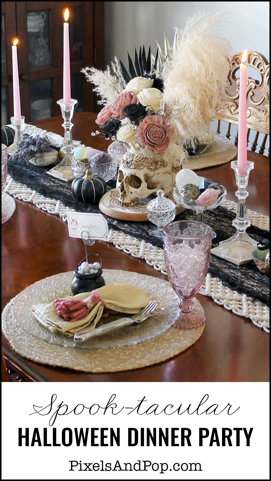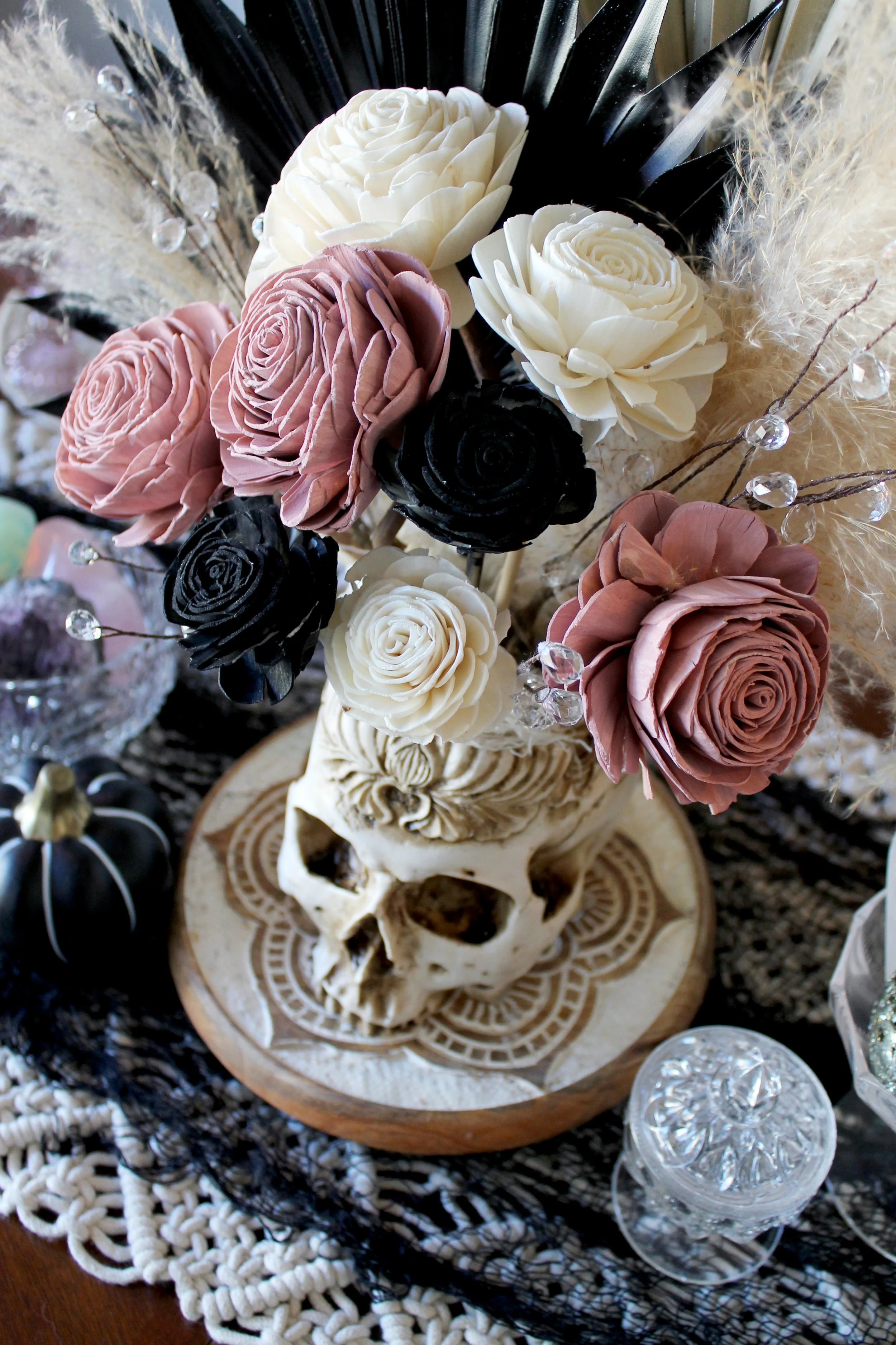 DIY Cauldron place card holders welcomed guests to their seats at the table, which was decorated with sprawling ceramic pumpkins and cut crystal bowls filled with gemstones, accompanied by mystical herbs. Dried palms & wooden florals in an ornamental resin skull vase served as the centerpiece, which sat upon a macrame table runner layered with a black mesh cloth.