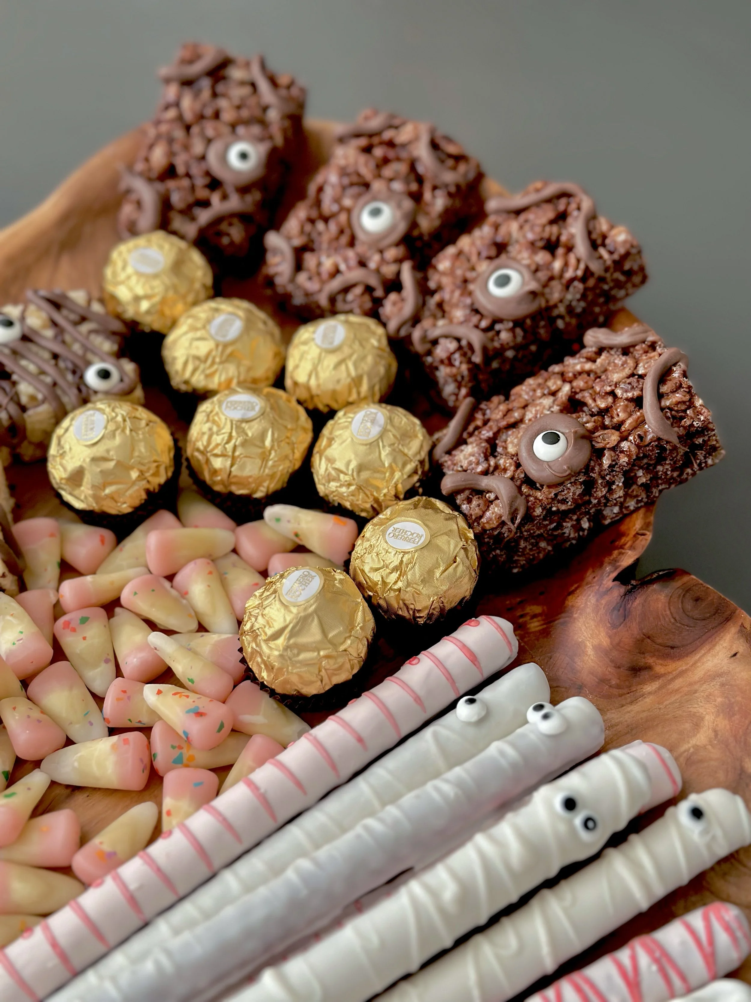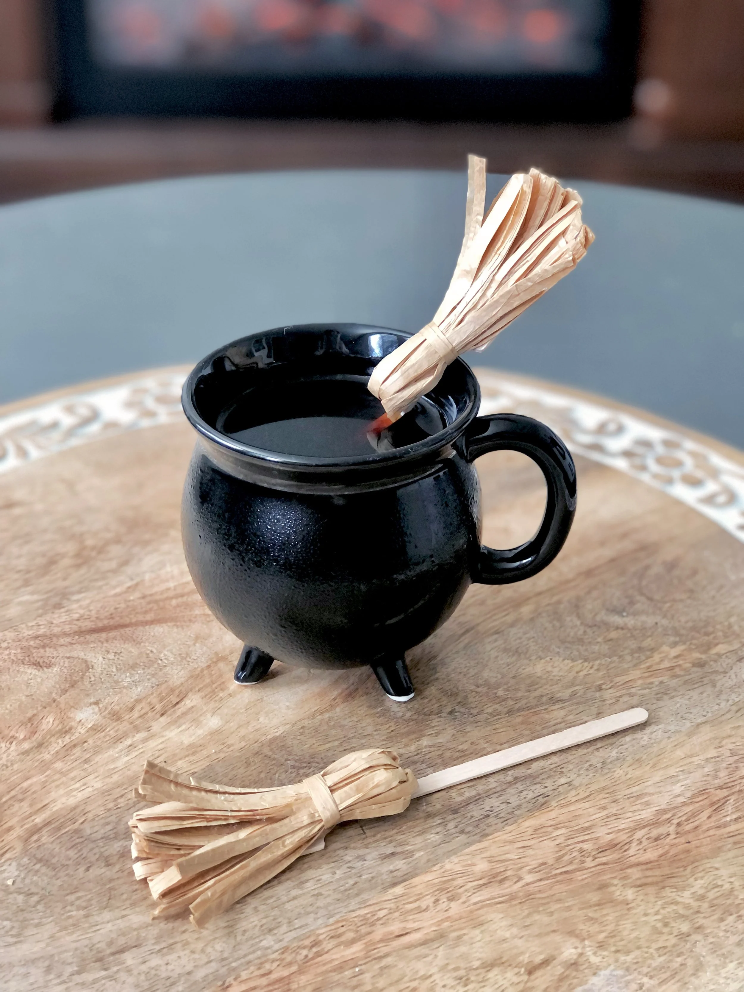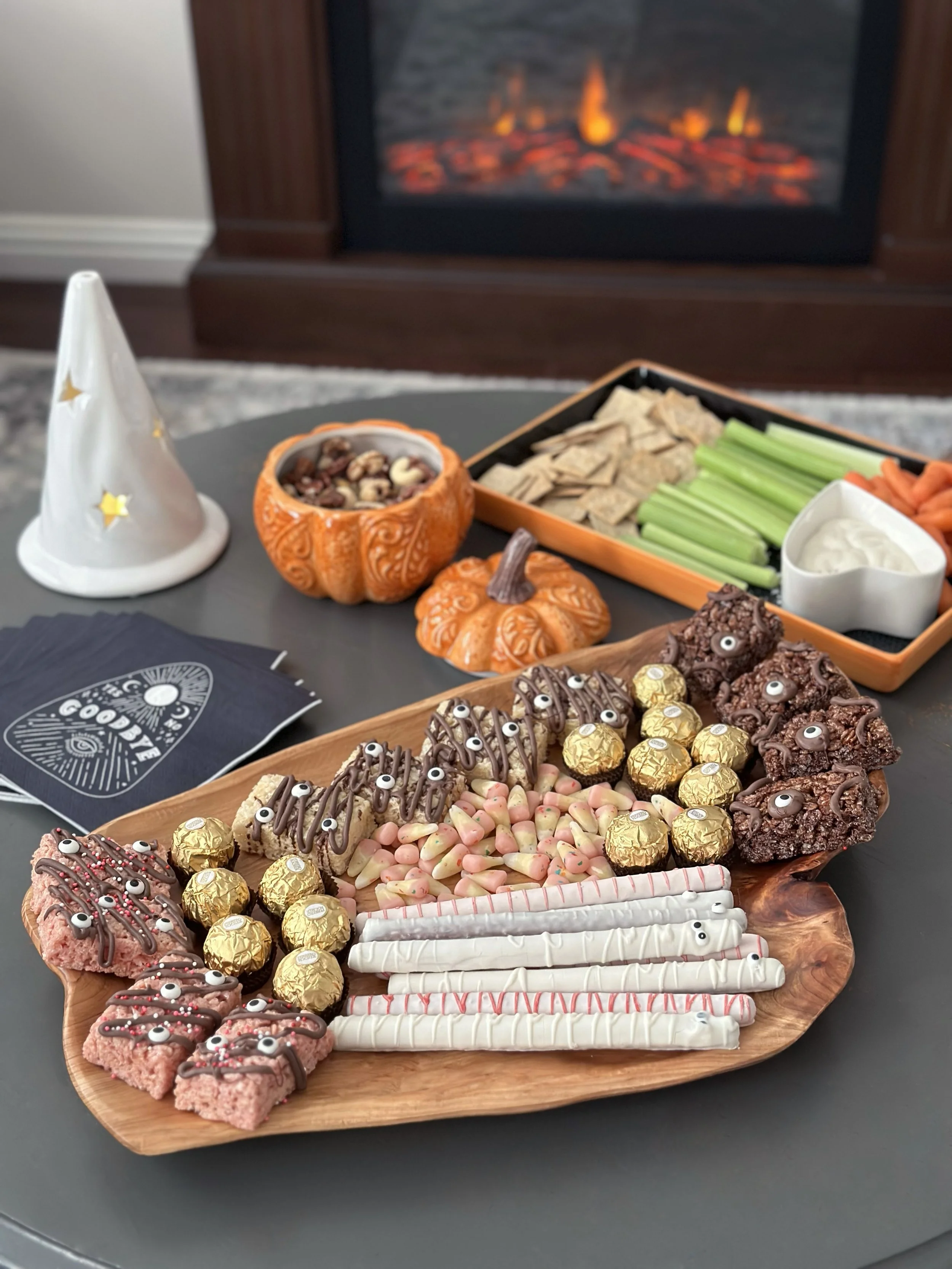 Upon arrival at the dinner party, guests enjoyed appetizers and treats in my living room as they sipped tea from cauldron mugs served with DIY broom stir sticks. I used chocolate melts to attach candy eyes to the Chocolate Pretzels and Rice Krispies Treats for a spooky touch.