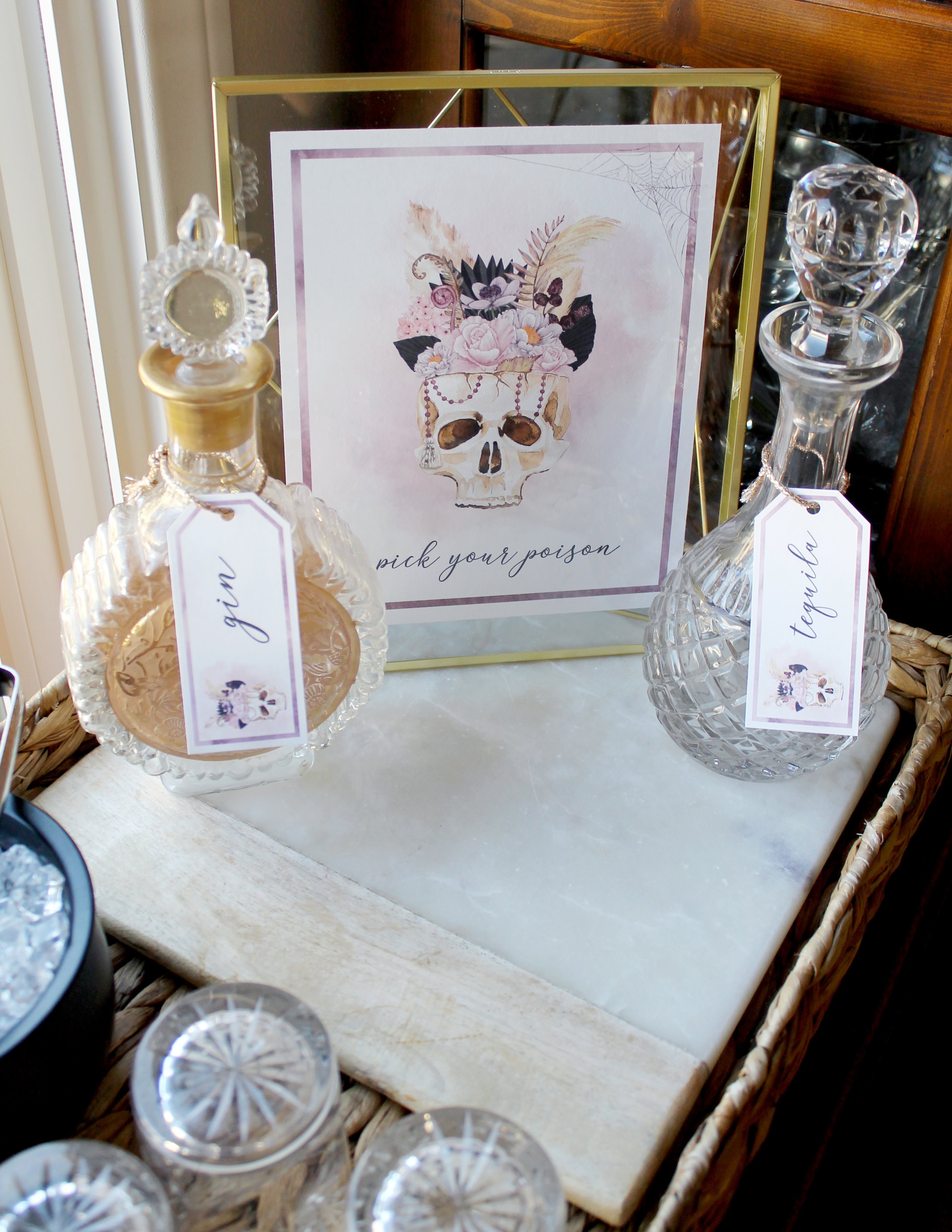 Once dinner was ready, guests were encouraged to pick their poison from the self-serve bar and pull up a chair at a spook-tacular tablescape! I recommend serving two different spirits along side 3 optional juice mixers, which you can label with these printable tags. To keep things festive, I served ice in a ceramic cauldron with stainless steel ice tongs.